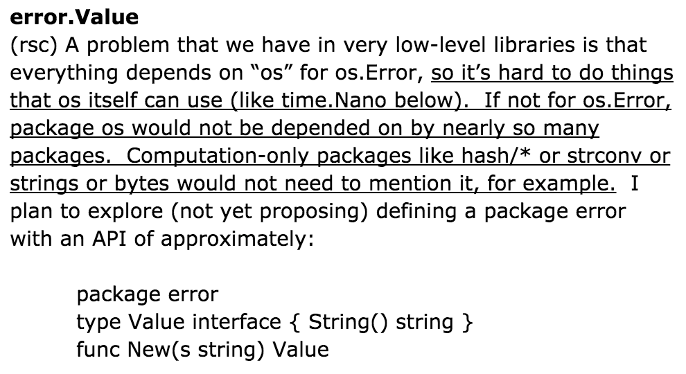 It begins with a precise, one-line statement of the problem: in very low-level libraries everything imports “os” for os.Error. Then there are five lines, which I’ve underlined here, devoted to describing the significance of the problem: the packages that “os” uses cannot themselves present errors in their APIs, and other packages depend on “os” for reasons having nothing to do with operating system services.