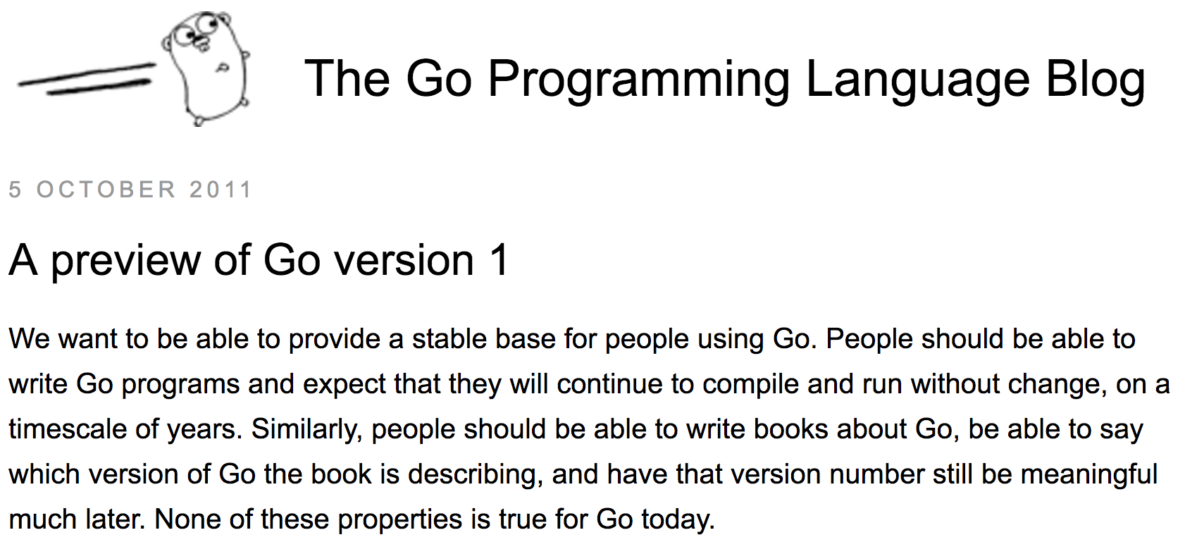 For the next two years, with the help of the new Go open source community, we experimented with changes large and small, refining Go and leading to the plan for Go 1, proposed on October 5, 2011.