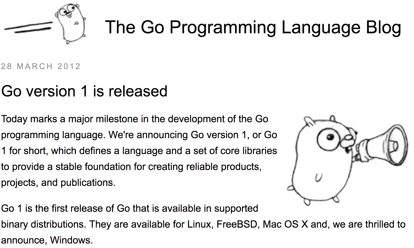 With more help from the Go community, we revised and implemented that plan, eventually releasing Go 1 on March 28, 2012.