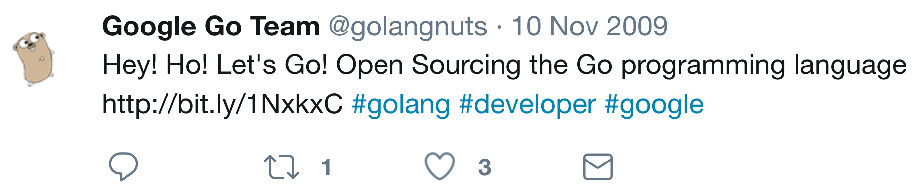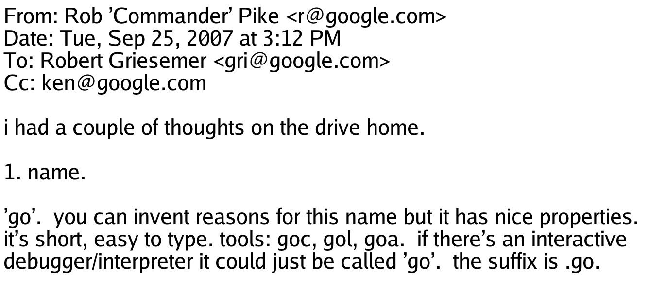 On September 25, 2007, after Rob Pike, Robert Griesemer, and Ken Thompson had been discussing a new programming language for a few days, Rob suggested the name “Go.”