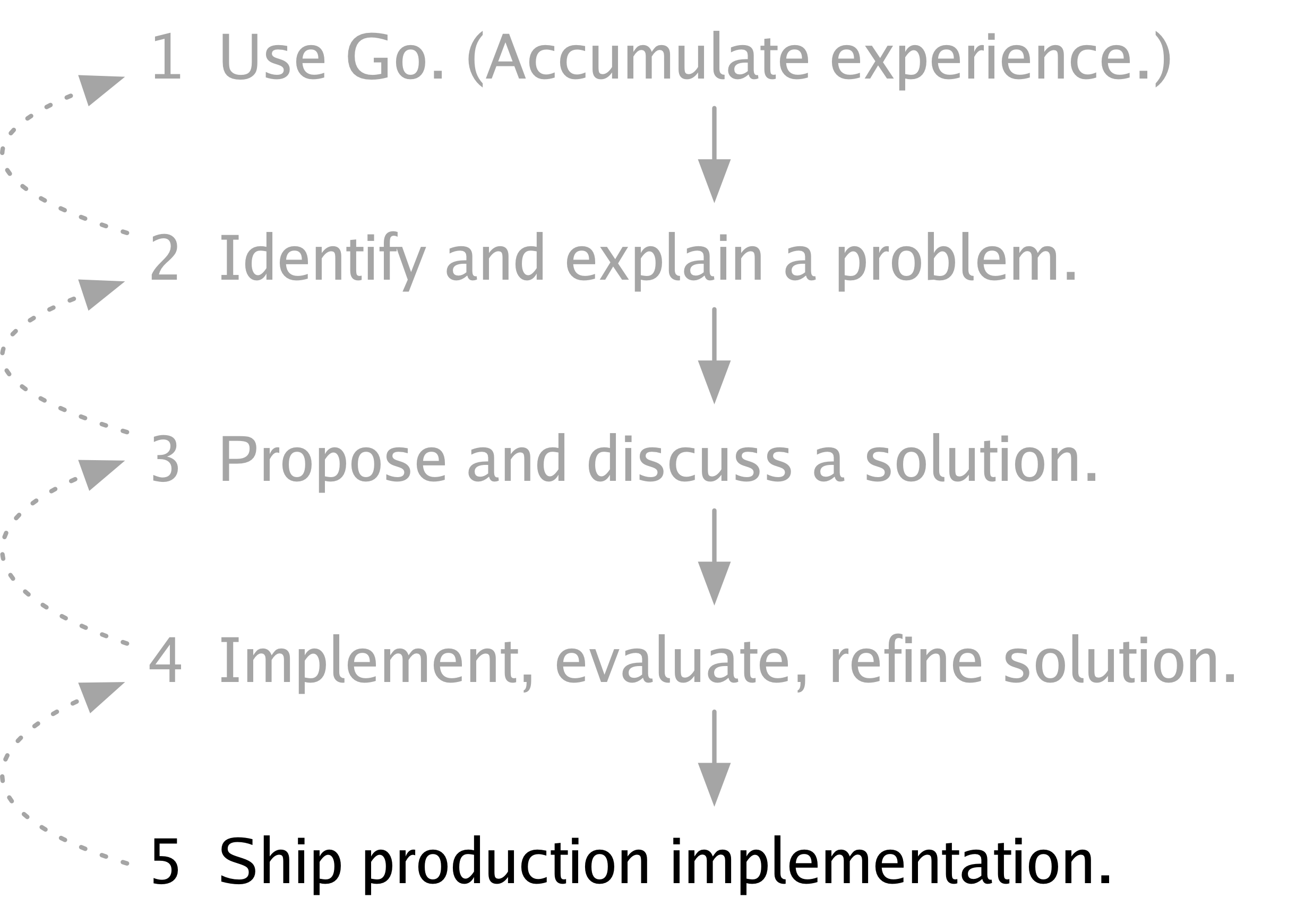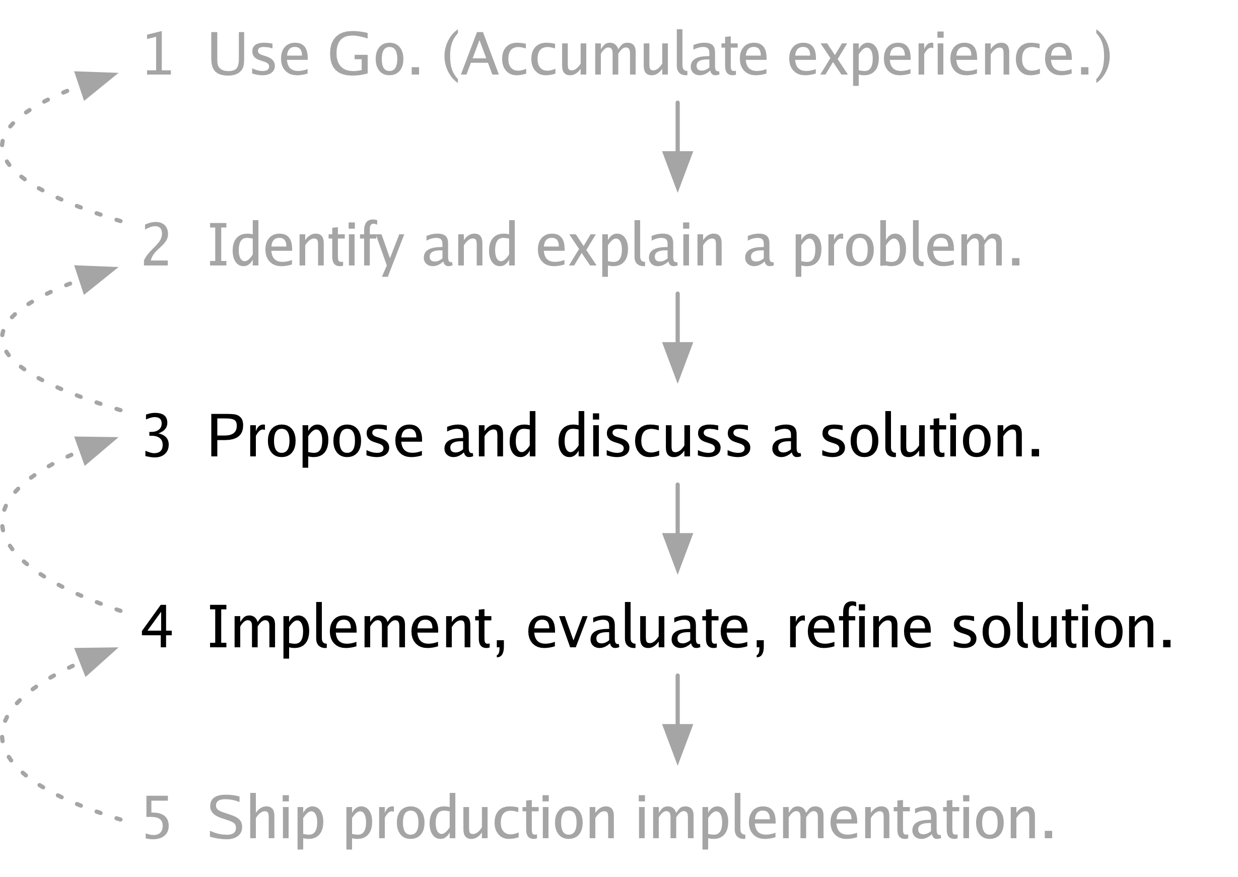 Although I don’t believe we’ve ever talked about this process as a whole, we have explained parts of it. In 2012, when we released Go 1 and said that it was time now to use Go and stop changing it, we were explaining step 1. In 2015, when we introduced the Go change proposal process, we were explaining steps 3, 4, and 5. But we’ve never explained step 2 in detail, so I’d like to do that now.